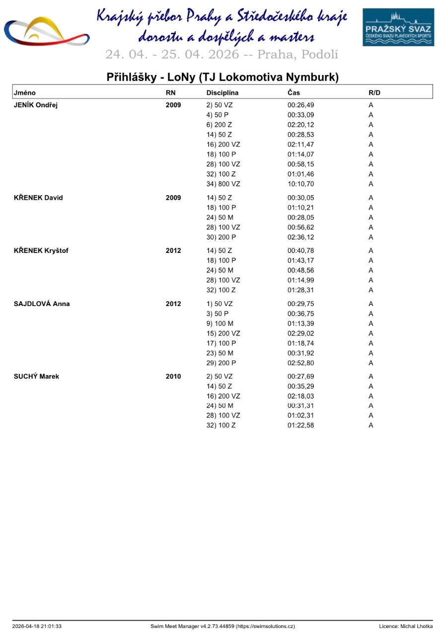 Odhlášky: Marek Suchý, do 22.4. do 18:00 (po termínu plavec hradí startovné)